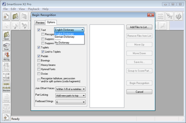 SmartScore X2 Pro能够将五线谱直接转换成简谱,为OCR应用程序的文本,软件可以实际扫描纸质文档,并提供它们的可编辑的文本格式内容,软件配备了一个内置的音色库,库包含乐团和人声合唱团法器的现实和精心挑选的声音,适用于不懂乐谱的用户。