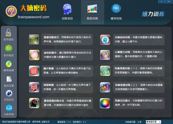 大脑密码脑力训练软件是一个帮助用户训练大脑思维的脑力开发软件,初期会通过简单的技巧实现大脑的无声环境,使思维都在此环境下运行,然后会进行放松和注意力训练、图片联想训练、词语联想训练、慧觉思维训练、右脑启动训练、心象能力训练、形象记忆训练等,最终实现高效、灵敏、快捷的大脑思维,并灵活应用于日常的学习和生活。