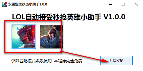 永恩亚索秒选小助手专为喜欢LOL的玩家们打造,能够帮助用户秒选永恩和亚索这两个英雄,因为lol游戏中亚索和新出的永恩这两个英雄实在是太难抢了,使用这款工具后玩家可以直接秒选永恩和亚索,软件简单非常实用,支持用鼠标右键通过管理员运行使用。