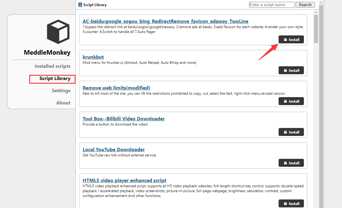 与油猴不同,大家无需自己手动跳转第三方脚本网站,而是可以直接在MeddleMonke插件的脚本管理页面安装新脚本。