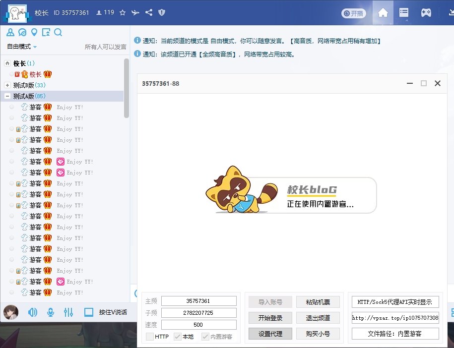 免费YYPC协议是专门为 YY PC端用户准备的游客协议免费版本,内置游客小号,支持代理登录,可保频道,可申请短位ID,上号速度1秒10个,单窗口挂号5000+,还有批量改名、极速上号、同时多频道在线登录、修改男女、定时上下号、全自动识别验证码统统支持,功能十分强大。