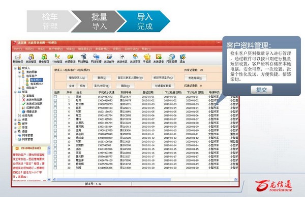 产品优势:龙信通检测站管理系统,支持批量个性短信群发,为每个车主发送包含名称、车牌号的个性短信,增强检测站与车主直接的亲切感,且个性短信手机基本无屏蔽,接收效果好。