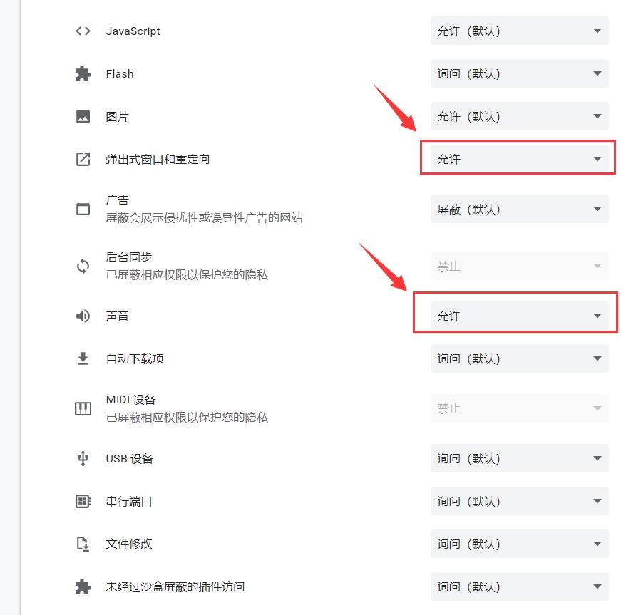 ⚠⚠需要更改“弹出式窗口和重定向”和“声音”两个权限为“允许”