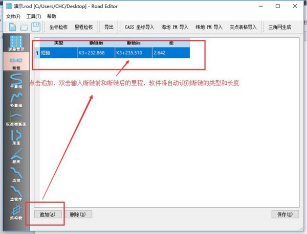 数据输入时,直接输入断链的开始和结束桩号,软件会自动判断断链的类型及长度。