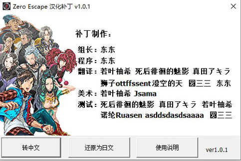 极限脱出九人游戏汉化补丁由民间的汉化组制作并分享,该汉化组制作了999以及善人死亡两款游戏的汉化,并且支持Steam正版,游戏目前只支持英文版和日文版,建议玩家使用日本版的游戏,再配合汉化补丁,汉化后的游戏可正常解锁成就,让使用中文的玩家们也能获得良好体验。