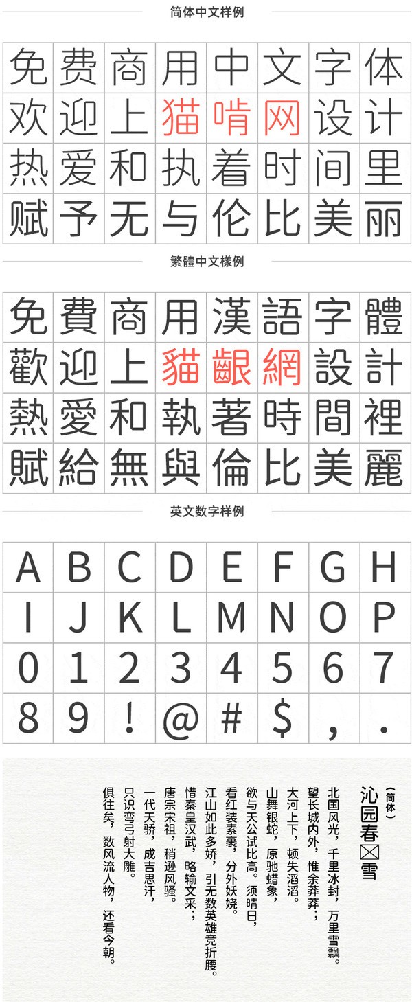 狮尾螺帽黑体基于思源黑体的拔脚改造而成,支持简体中文、繁体中文、韩文与日文,工整简洁,具有强烈的视觉冲击力,使用范围很广,可以应用于报纸和杂志和书籍中常用字体,、海报、个性促进品牌标志设计、字体设计等。