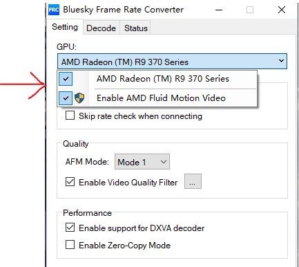 运行「BlueSky FRC」后,GPU 位置选择你的显卡,并勾选 "Enable AFM Support" 功能。