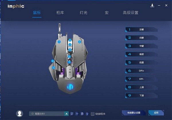 1、打开驱动程序后,您可以看到整个界面仍然非常简单。 在功能方面,有几个选项:“鼠标”,“枪库”,“灯光”,“宏”和“高级设置”。 当前界面是“鼠标”选项,鼠标图标位于中间。 每个键都有编号。 单击右侧的相应数字以设置按键功能。