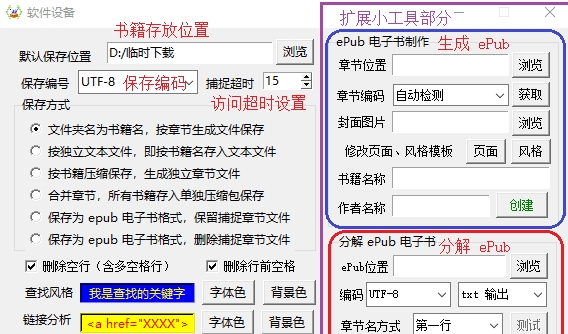 附带小工具:ePub 电子书制作、分解工具,支持多以章节存放的书籍生成ePub 文件,也可以将 ePub 文件分解为多章节的文本文件。