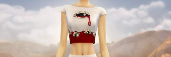 模拟人生4游戏中玩家可以将为角色穿上各种好看的衣服,打扮出各种造型,本次带来的模拟人生4血眼服装MOD就是非常多的人都在使用人用的一款非常有个性的女性上衣,衣服的版型比较简约,就是简单的白色短款T恤,亮点在于衣服上的血眼图案,效果如下图,都是眼睛和血,有那么一点恐怖,胆小的玩家们不建议入哦~
