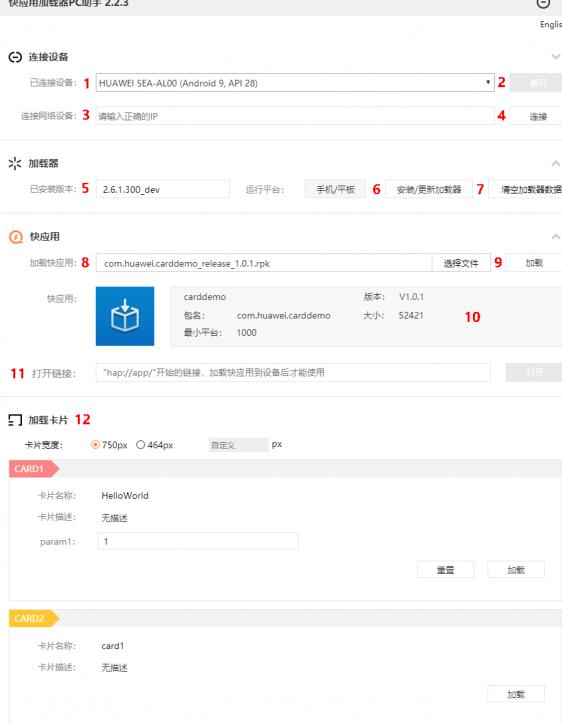 快应用加载器PC助手能够帮助用户无需通过IDE就可以测试快应用的功能,使用的时候需要与测试卡片和hap链接,非常非常方便,是华为公司推出的最新应用加载手机pc端助手软件工具,在电脑上安装快应用加载器PC助手后,可以运行打包生成的rpk包,详细的使用方法,请参照本文教程!