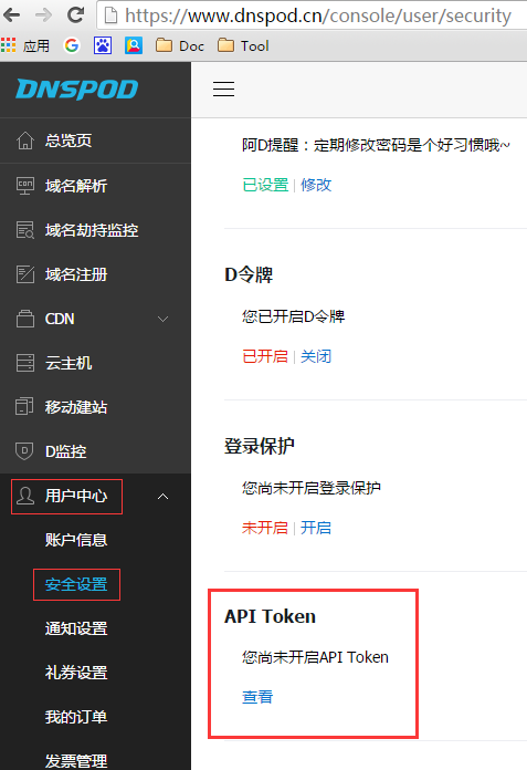 登陆DynSpod需使用API ID,如果尚未获取API ID, 需要首先登陆DNSPod官网管理控制台获取API ID以及Token,方法如下: