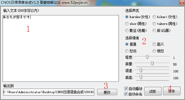 CNOS日语语音合成工具可以帮助用户将日语文字快速转换成语音输出,支持自定义声优,还提供了多种情绪比如普通的、悲伤的、高兴的、愤怒的,连音量、语速、音高都可以调节哦,用户能够根据语境、场景需求自由选择,输出的语音不仅精确清晰,还可以在线试听和保存,可以说非常非常实用了~