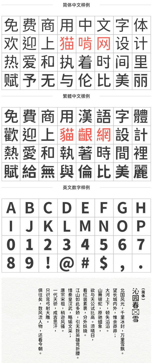 狮尾三角黑体基于思源黑体笔触开花和拔脚改造,更加简明现代化的字体。支援简体中文、繁体中文、韩文与日文;欢迎大家自由应用、自由优化、自由改作!