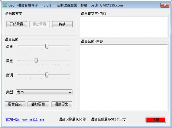 osdll-语音合成帮手绿色版能够帮助用户将文字快速转换为语音,而且支持调节输出语音的语速、音量、音调,可以自定义发声类型,最长能够录制60秒,语音合成最多512个汉字,使用的时候只需要将文字输入进内容,然后设置好需要调节的参数即可,转换出来的语音清晰准确,可以一键导出,非常非常方便。