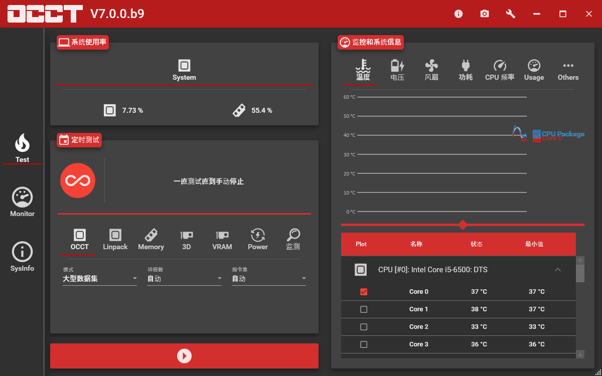 OverClock Checking Tool支持为 CPU、图形卡和电源提供测试功能,是非常多的人都在使用人用的一款检测电脑硬件的非常好用的工具,能够提高整体系统性能,软件拥有多达16个核心支持,快速检测硬件错误或超频问题,还嵌入了监控引擎,可以生成显示测试期间温度和电压的图表,以便于诊断并查看计算机在高负载下的反应。