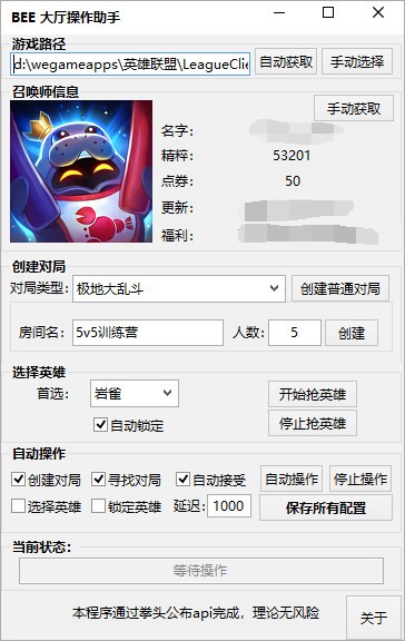 BEE大厅操作助手又叫lol大厅多功能操作台,专为喜欢英雄联盟的玩家们制作,能够帮助玩家们秒选游戏英雄,提供英雄联盟选英雄、秒抢英雄、创建5v5训练营等多种功能,软件绿色安全,未修改内存,全部是官方公布api,让玩家永久免费使用。
