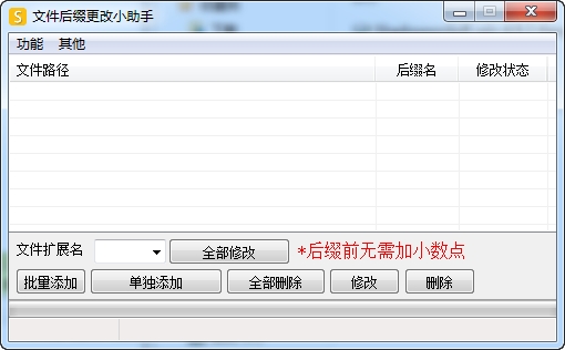 前段时间看到52里有一个类似的软件,不过那是改文件名的,我这是改后缀的,我以前也发过类似的软件,那个改目录下的全部文件,这个是升级版,不仅可以添加目录,还可以单独添加文件,可以批量删除项目及单独删除项目。菜单栏有一个“功能”和一个“其他”,功能下有语言选择,包括简体中文、繁体中文及英文,至于那个其他,没啥屌用。