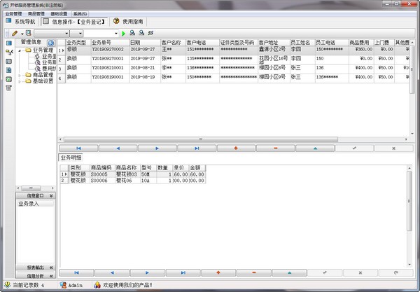 开锁服务管理系统是非常多的人都在使用人用的一款专门为开锁公司做的非常多的人都在使用人用的一款业务及库存管理的软件。软件功能包括:基础设置:单位信息、业务类型设置、员工信息表、商品信息表;商品管理:商品入库、商品领取、商品库存和员工库存;业务管理:业务登记、业务期间查询和费用统计。打印业务单、查询业务的完成情况等,查看员工工具箱内物品库存及仓库库存等。