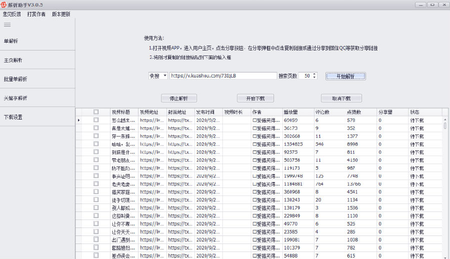 解析助手功能强大齐全,为用户提供解析短视频的功能,支持多种平台,操作非常简单,用户只需输入关键字即可进行搜索,除了在线播放观看外,通过这款软件我们还可以对所需要的短视频内容进行批量下载,适用于自媒体搬运的用户。