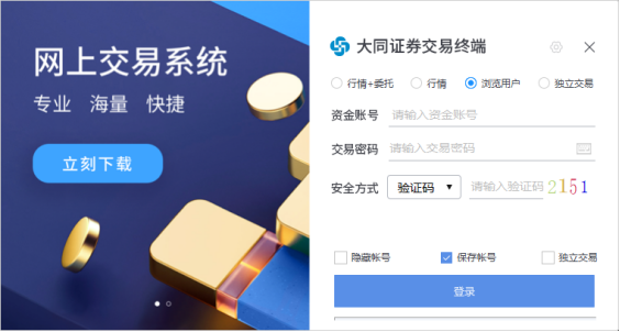 登录页面依然采用扁平化的风格,融入简约的要素,支持行情+委托、行情、浏览用户、独立交易等四种方式。