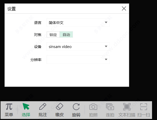 4、点击【设置】按钮,可以设置语言、对焦、设备等参数;