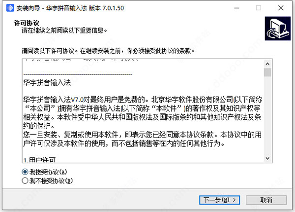 1、下载解压,得到华宇输入法windows10版,接受条款依提示安装;
