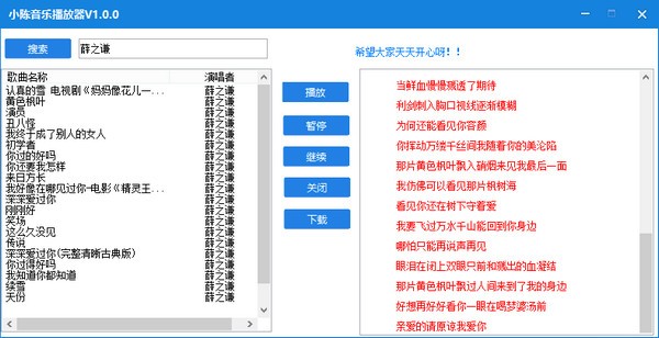 小陈音乐播放器支持一键搜索全网热门歌曲,让用户收听到各种不同类型和风格的音乐,并且能够免费在线下载,付费音乐也可以在线免费听,操作简单,只需输入音乐名称或者歌手的名字,就能找到想听的歌曲,软件界面简洁,无需安装,支持各大平台的会员音乐播放。