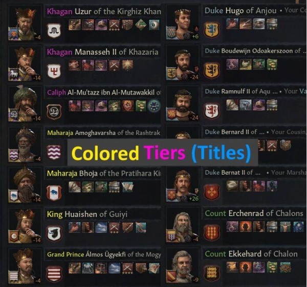 想要给十字军之王3游戏中的角色都换上彩色头衔嘛?那就赶紧来试试这款十字军之王3彩色头衔MOD吧!由“birdyonex”专为喜欢这款游戏的玩家们制作,使用后就能将游戏中所有人物的头衔颜色都改变,变成五颜六色的,看着心情应该也会更好吧~