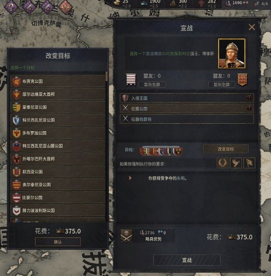十字军之王3一战定乾坤MOD是非常非常实用的功能型mod,补丁使用后能让玩家一次性攻打敌对帝国/王国内多个目标,当然玩家也可以选择敌对帝国/王国内的所有目标,只要能够支付相应的威望、虔诚,并且拥有足够的勇士、征召兵。