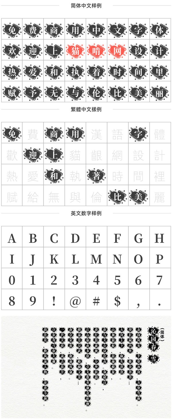 思源宋体花样心纹是在“思源宋体 粗体”基础上提取英文与符号共123个字形,汉字6763个常用字修改而成,所谓花样字体,笔者自定义为:给常规字形加一些修饰花纹效果。本次共享的花样字体只对6763个汉字添加花纹,英文与符号保持原字形不变,大部分花样字体并不适用于大篇幅的文章使用,主要作用于标题或一些特殊场合,如图片水印等等。