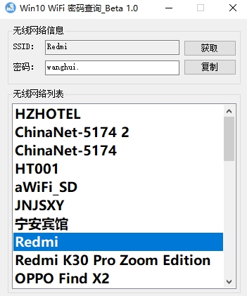 查看本地WiFi密码工具是使用C#开发的非常多的人都在使用人用的一款工具,使用的是.net4.5的库(Win10自带),此工具体积很小只要37KB,不需安装打开直接可用,可以放在U盘中随身携带,走到哪里都可以使用。