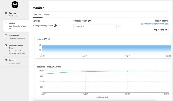 WP Umbrella每1-10分钟检查您的正常运行时间。您可以直接在您的WordPress管理面板上访问您的停机时间历史和性能包机。