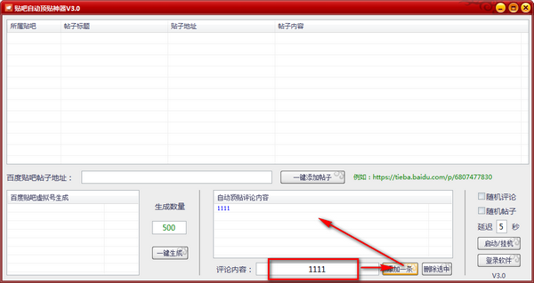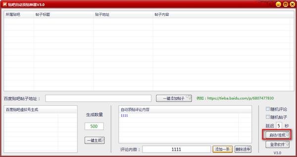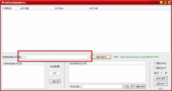 贴吧自动顶贴神器可以让您在贴吧发的帖子始终处于首页,支持自定义某个帖子以及发帖内容,还可以多个账号随机发帖,使用方法非常简单,只需要将要顶贴的链接,输入要顶贴的内容,登录多个账号点击开始即可,非常适合需要营销产品的用户们使用。