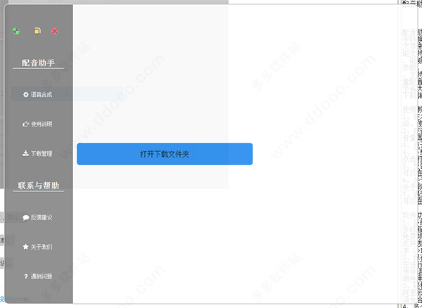 1、在本站下载安装配音助手软件,运行软件可直接使用,可以看到有语音合成、使用说明、下载管理、反馈建议、关于我们等;