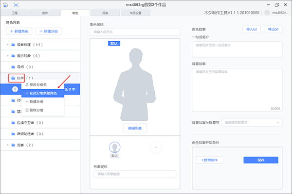 4、或者读者扮演者下方的分组中选择一个,右键新建角色;