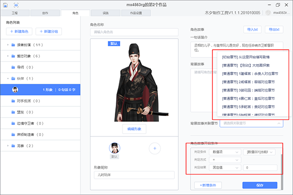 7、接着选择背景关联的章节,以及角色故事开启条件,最后点击保存,在小说中即可显示相对应设置的信息。