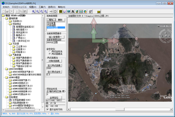 (1)基础数据模块:对一个项目的污染物、污染源、项目特征和气象数据进行录入、保存和必要的预处理。项目特征包括背景图及其定位、地形高程、现状监测数据以及敏感点和厂界线定义。