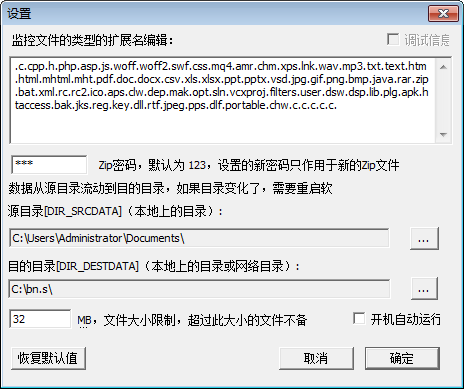 程序会监控源目录,适时地将源目录中修改过的文档文件压缩加密复制到目的目录。