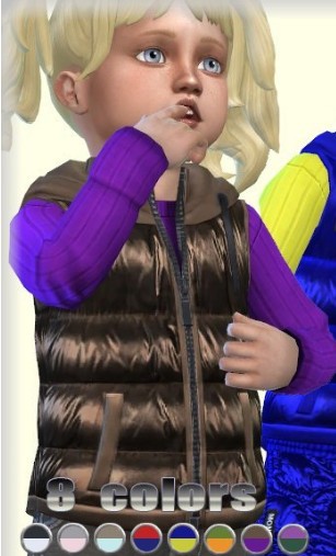 模拟人生4小女孩的羽绒背心MOD使用后会在游戏中新添非常多的人都在使用人用的一款非常保暖的儿童羽绒连帽马甲,可以给游戏中的小女孩穿上,具体上身效果可以参考下文中的图片展示,非常厚实,有8种配色可以选择,玩家可以根据自己的喜好挑选,如果觉得喜欢的话可将安装包下载后按照下方使用说明操作获取哦~