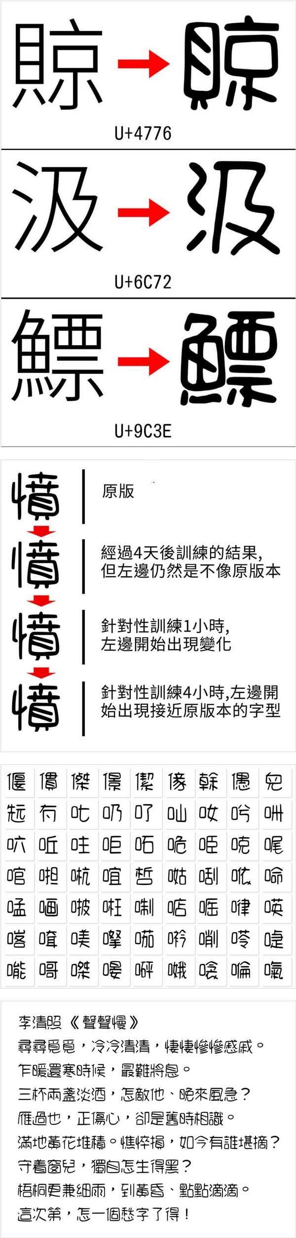 这次是1万2千字的版本,大约用了2个月时间完成制作。清松手写体4的风格跟一般字变化比较大,在整过训练过程中,要反覆检视结果,然后再训练,再检视,直至大部份的字型跟原版接近才能开始后期制作。