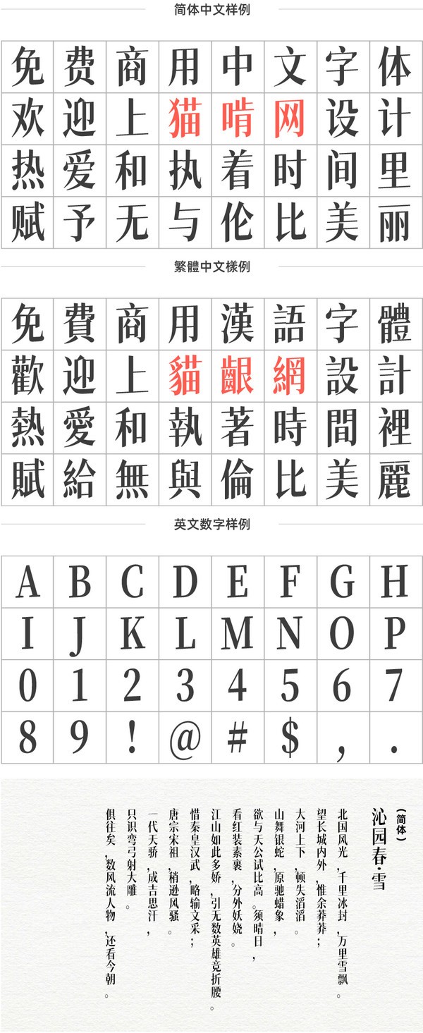 猫啃网风雅宋是猫啃网网友@新愚公利用业余的时间把狮尾四季春通过程序进行改造,压缩字体宽度,并把字体向上拔高,有点类似仿宋字形。猫啃网风雅宋只有一个字重,采用狮尾四季春SC-Bold。原字体的一些衬线还依然保留。修复过程中发现这些字体基本上用不上,所以没有进行修复,所以有兴趣使用的网友如发现常用字体还有衬线存在的请告知,一定时间内会修复。