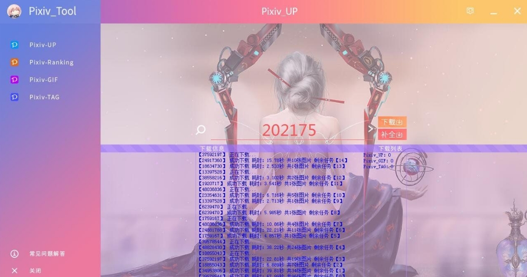 1:Pixiv_UP这个是下载画师作者下的所有作品,例如作者的主页是https://www.pixiv.net/users/202175,那么ID就是202175,在输入框填写202175点击下载即可动图会自动下载并合成,详情往下看