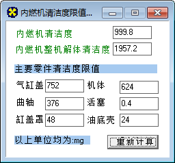 能够计算气缸盖、机体、曲轴、活塞、缸盖罩、油底壳等清洁度限值。