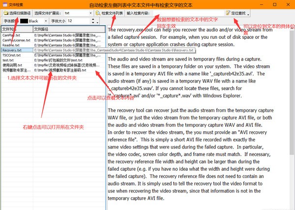 2、选择检索文件列表,数据想要检索的文本中的文字,回车生效,可以定位到文本位置