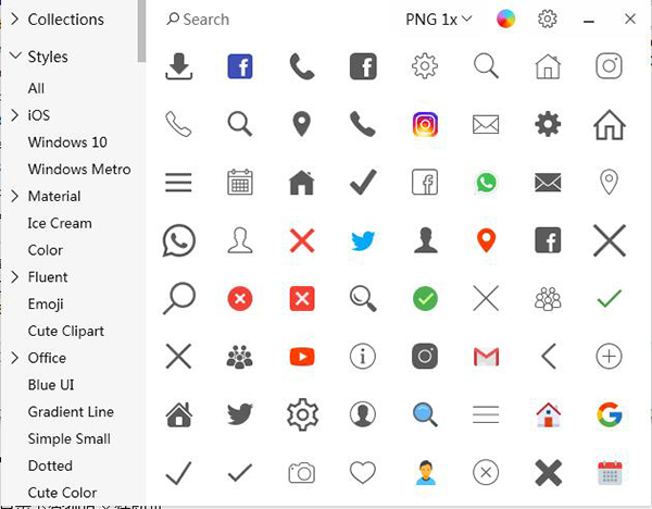 使用搜索字段查找所需的图标,或使用左侧面板按样式和类别搜索图标。