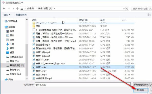 2、点击添加按钮之后,下一步就会打开选择文件的界面,我们在这界面中选择目标mkv格式的文件之后点击右下角的打开按钮;