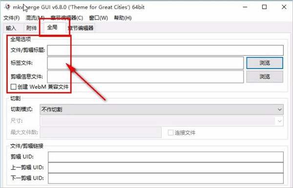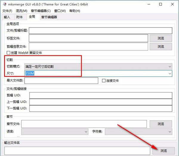 3、点击打开按钮将视频成功添加进来之后,点击切换到全局这个模块当中,然后在全局模块中可以设置文件剪辑的标题、标签文件等等,点击后面的浏览按钮浏览选择即可;
