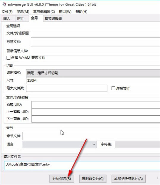8、最后设置好输出文件名和输出目录之后,我们点击下方的开始混流按钮就可以开始切割mkv文件了。