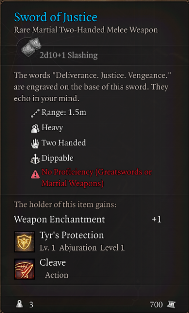 博德之门3正义之剑至尊版MOD是由AfroCircus制作并分享的武器增强mod,专为喜欢博德之门3的玩家们打造,使用后能够大幅度地增强正义之剑,现在正义之剑的伤害变为了2d10+1,运气好能够直接一击击杀怪物的武器,伤害非常高,让玩家变得更加强大。